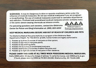 The back of an Oklahoma medical marijuana license card lists advisory warnings and the amounts of marijuana allowed in a license holder’s possession.