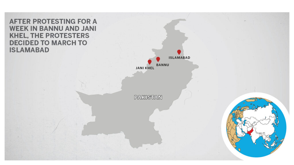 After protesting in Jani Khel for a week without any official response, Lateef and the local demonstrators were joined by residents of nearby Pashtun tribes. They decided to march towards Islamabad to put forth their demands.