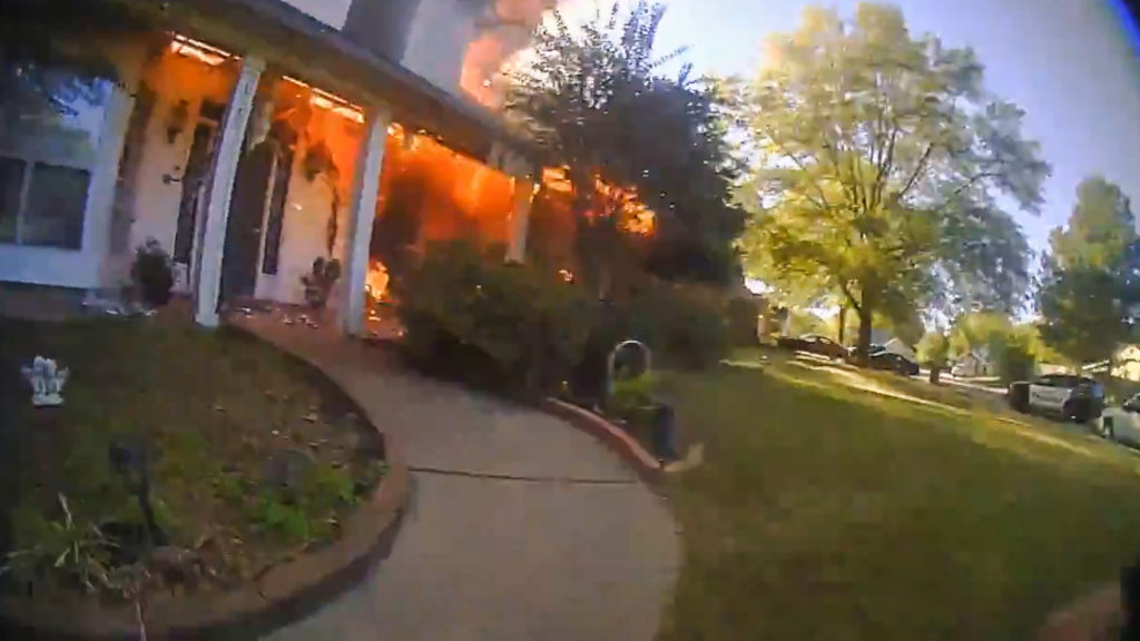 In the video, the officer, identified as Officer Carson Howard, is seen exiting his patrol car and sprinting towards the blazing home. Without hesitation, he dashes into the house and identifies himself to the trapped occupants, who were attempting to corral their dog.