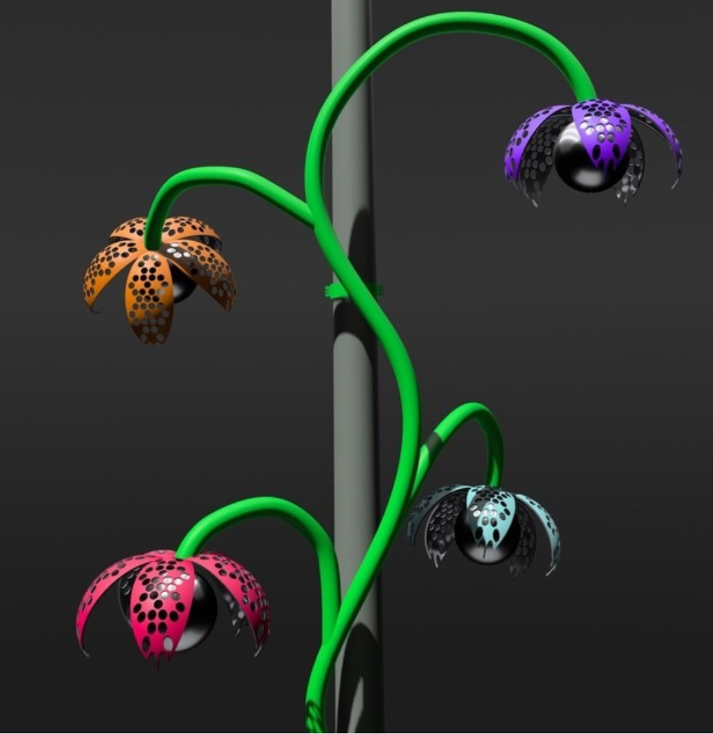 “Galactic Bloom” represents the latest evolution of Tyler FuQua Creations acclaimed “Space Plants” series, which first flourished in Portland, Oregon in 2000. This extraordinary work, standing at an impressive 12 feet tall with four blossoms reaching towards the sky, embodies the essence of artistic growth. The use of stainless steel not only lends a captivating luster, but also symbolizes the enduring nature of artistic expression.