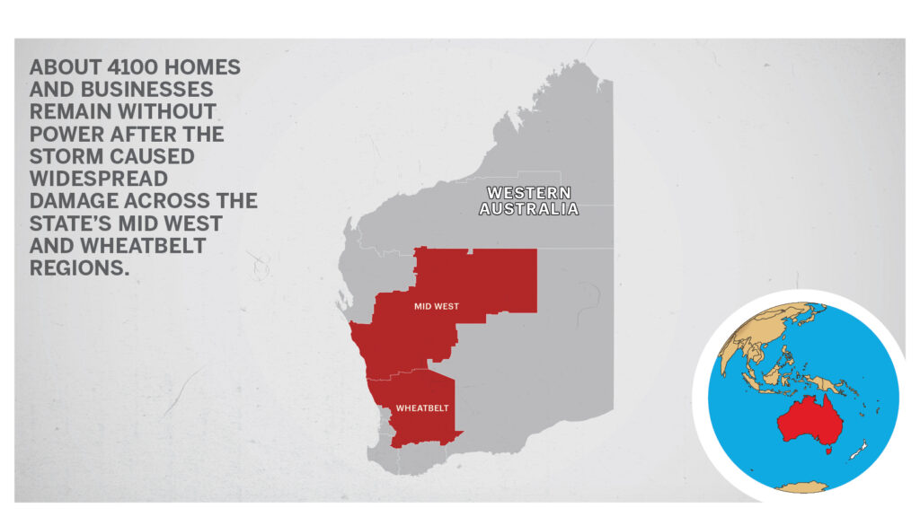 About 4,100 homes and businesses remain without power after the storm caused widespread damage across the state’s Mid West and Wheatbelt regions.