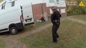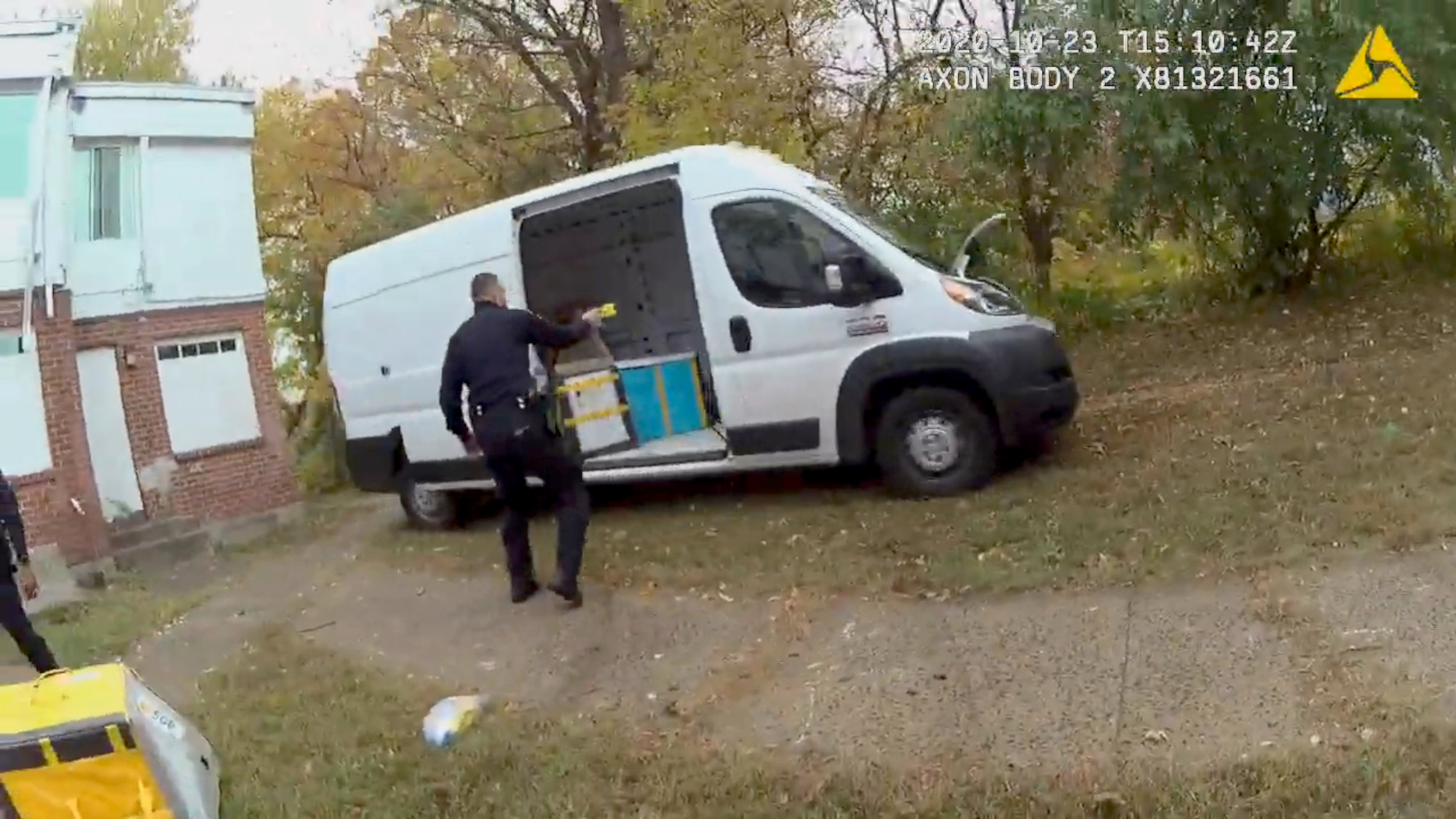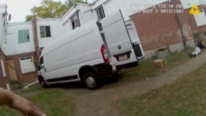 Police were able to track down the stolen vehicle to the backside of a series of buildings on Westland Street by reviewing CCTV footage that shows two men removing boxes from the back of the van. In video taken by police body cameras, officers approach the vehicle while one of the suspects stands behind it.
