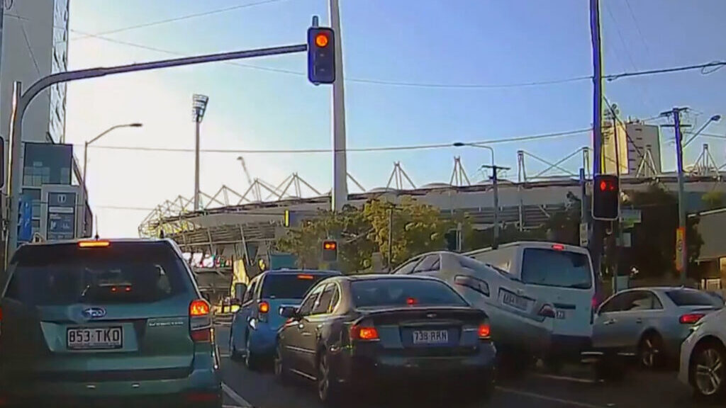 The Queensland Police released the footage on Twitter with the message: “A 20-year-old man has been charged after allegedly crashing through vehicles in Brisbane yesterday afternoon. Luckily, no one was seriously injured.”