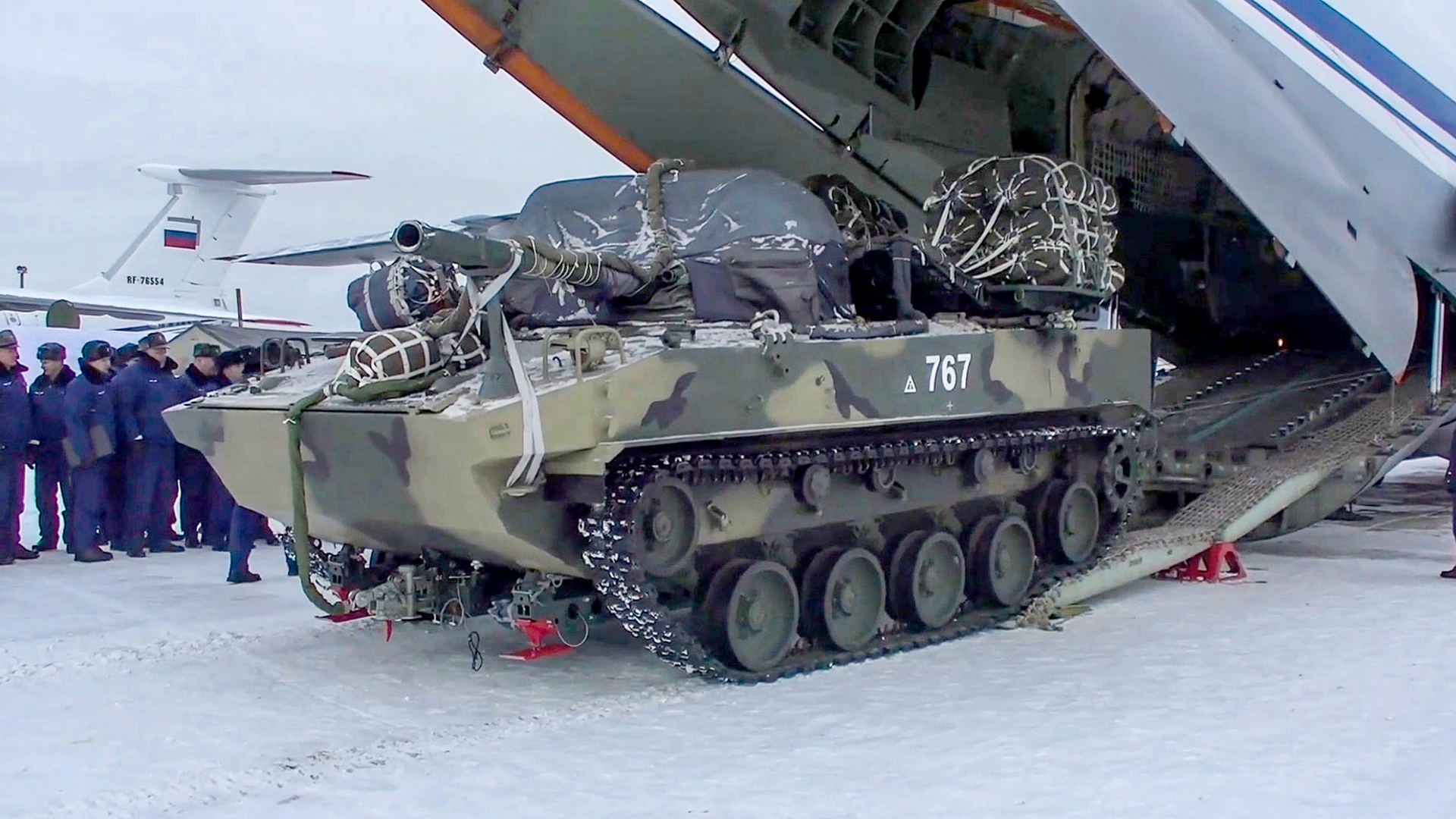 A BMD-4M amphibious infantry fighting vehicle was the first to be dropped, followed by the paratroopers. It is seen landing safely and according to the protocol.