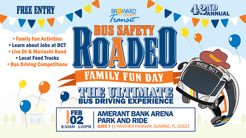 BROWARD COUNTY, FL – Broward County Transit (BCT) is excited to announce that the annual Bus Safety Roadeo is taking place this year at the Amerant Bank Arena, 1 Panther Parkway, Gate 7, Sunrise, FL 33323 on, Sunday, Feb. 2, 2025, from 8:30 a.m. to 1 p.m. The highly anticipated and dynamic competition will highlight the outstanding skills of BCT’s bus operators celebrating their unwavering commitment to safety, efficiency, and public service excellence.
