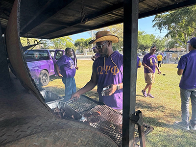 On March 15, 2025, Brothers David Dickerson and Anthony Barber organized and planned for 45th Charter Day Celebration at Pompey Park. A semi-open grill filled with arranged racks on wheels was delivered to cook the best burgers, chicken, hot dogs, and ribs prepared by the famous Troy’s Barbecue. Brothers Dickerson and Barber planned for a feast of the nearly 80 plus membership. When the brothers convened, they enjoyed the great weather, music, and of course, the scrumptious meal.