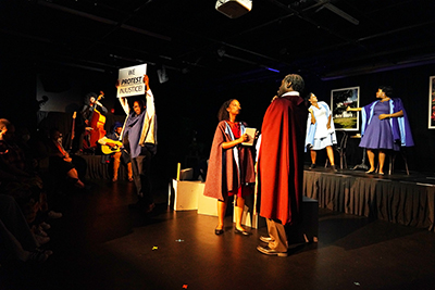 “Xaire” Goodridge, whom also served as the Narrator and Casted as the role of “Lorenzo”. One very particular scene that stood out from the rest was during Scene 8, Act 1 when Antonio bursts from the back of the Audience welcoming us to his “Fiesta Club”. The scene opens with an exciting and unexpected crowd interaction piece lead by Antonio. This unique twist to contemporary playwriting, catches the crowd off-guard by infusing participatory lines into Antonio’s performance to the audience. In a very witty and clever manner, Antonio was able to get crowd members to willingly participate in the scene— as we BECAME THE VERY FIESTA CLUB, the play included in their script.