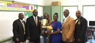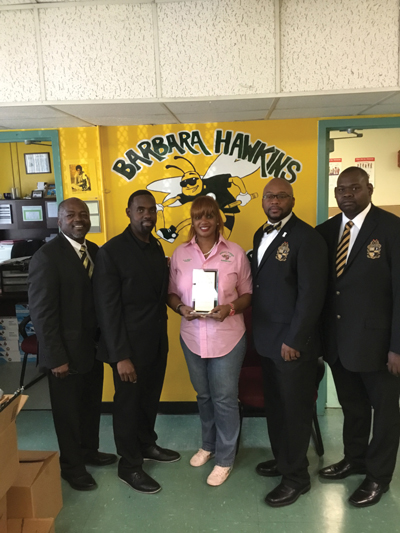Brothers Chris Stevenson and Bro. Takevess Hatcher, Julie Francis (2019 GSEA Instruction), Brenda Swain (Principal), Brothers Edward Woodbury, and Bryan Jones during the award presentation at Miami Shores Elementary School.