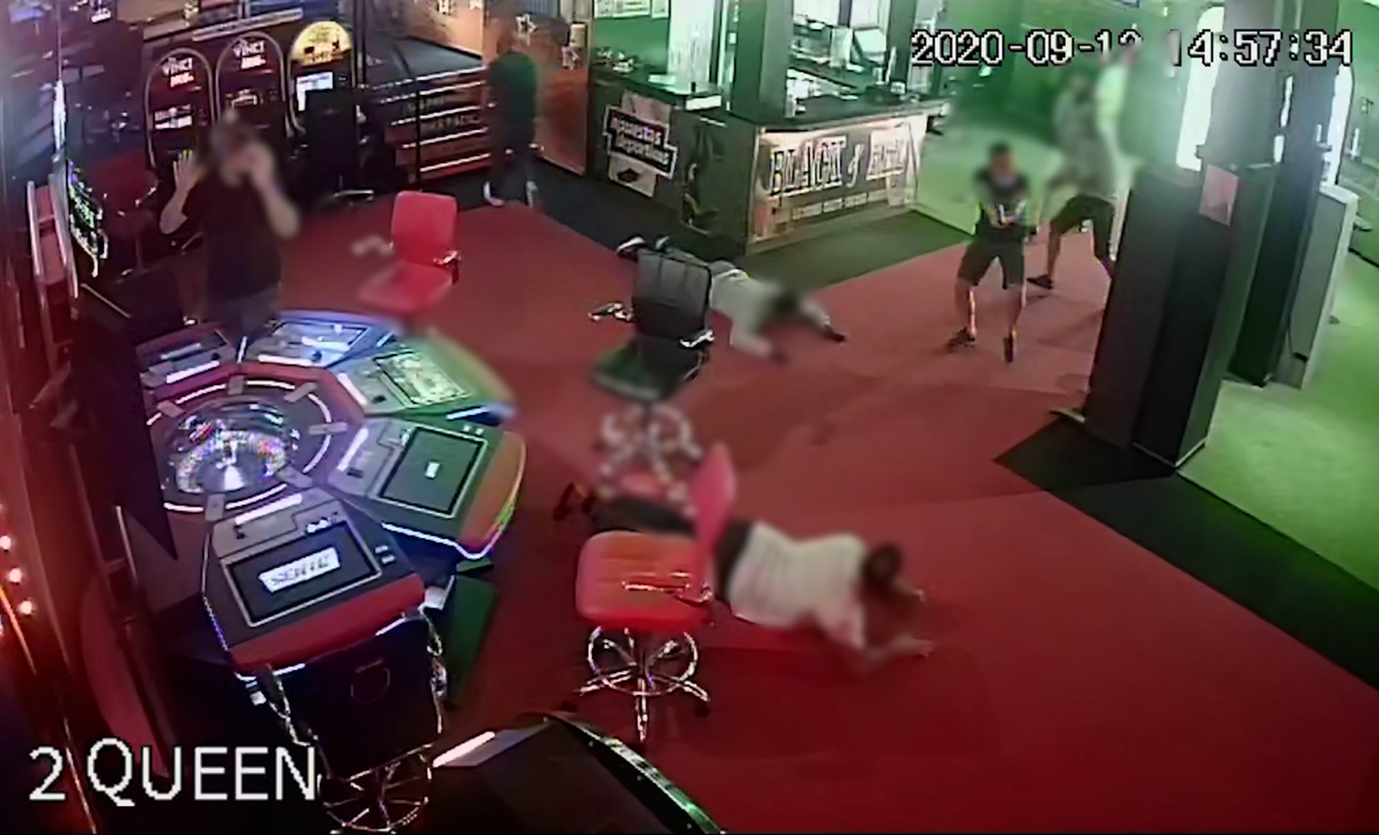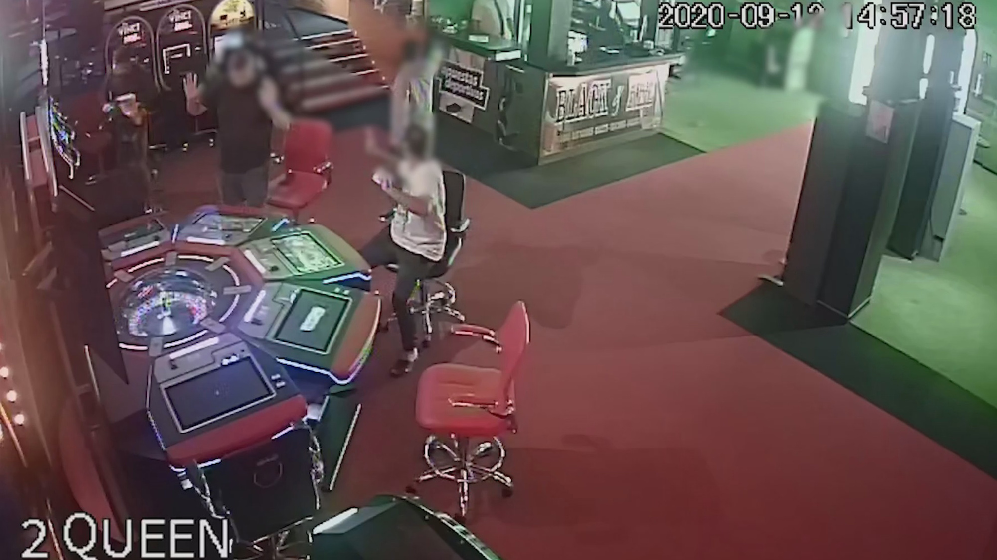 Recently released security camera footage of the attempted heist shows three men enter the mini-casino while a fourth waits outside. One of them approaches clients playing roulette, pointing a fake gun at them and telling them to sit down. Meanwhile, the other two rob a cash register and hit a slot machine with a rock.