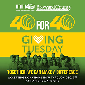 - NAMI Broward County:The National Alliance on Mental Illness (NAMI) is a grassroots organization dedicated to supporting individuals living with mental health conditions—especially serious mental illnesses—as well as their families, caregivers, and friends. As we enter this season of thanks and giving, NAMI Broward County is proud to mark 40 years of service. This Giving Tuesday, honor “40 years of impact” with a contribution of $40—or any amount featuring “40” (like $140, $240, $340, or more!). Each dollar raised supports no-cost mental health related services for thousands in Broward County, helping build a supportive, stigma-free community.