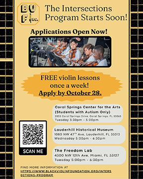 Applications for Intersections are open now through October 28th, 2025. The Black Violin Foundation is currently seeking new applicants, especially at the Coral Springs location, where all students are welcomed into an environment filled with love, music, and creativity.
