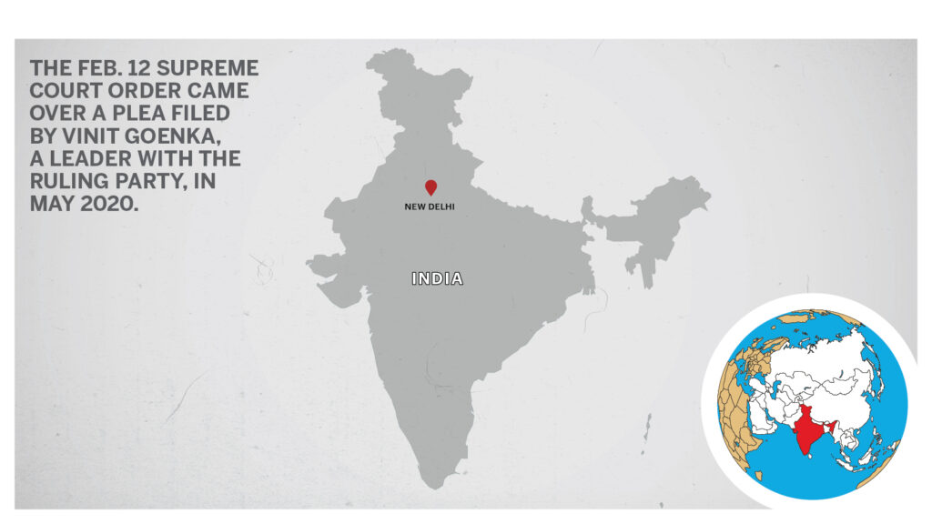 The Feb. 12 Supreme Court order came over a plea filed by Vinit Goenka, a leader with India’s ruling party, through advocate Ashwani Dubey in 2020.