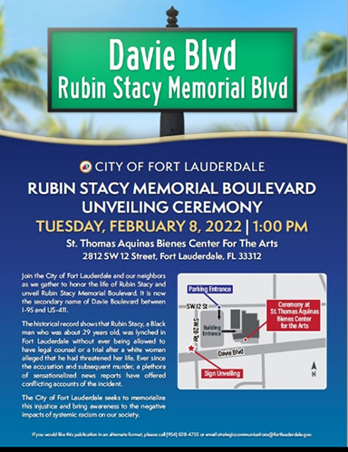 The city of Fort Lauderdale invites the community to join in as they host the Rubin Stacy Memorial Boulevard Unveiling Ceremony on Tuesday, February 8, 2022, at 1 p.m.