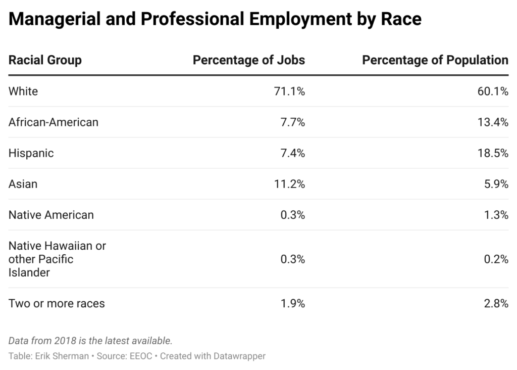 More broadly, Equal Employment Opportunity Commission data, analyzed by Zenger News, shows the lion’s share of managerial and professional jobs remain held by white people.
