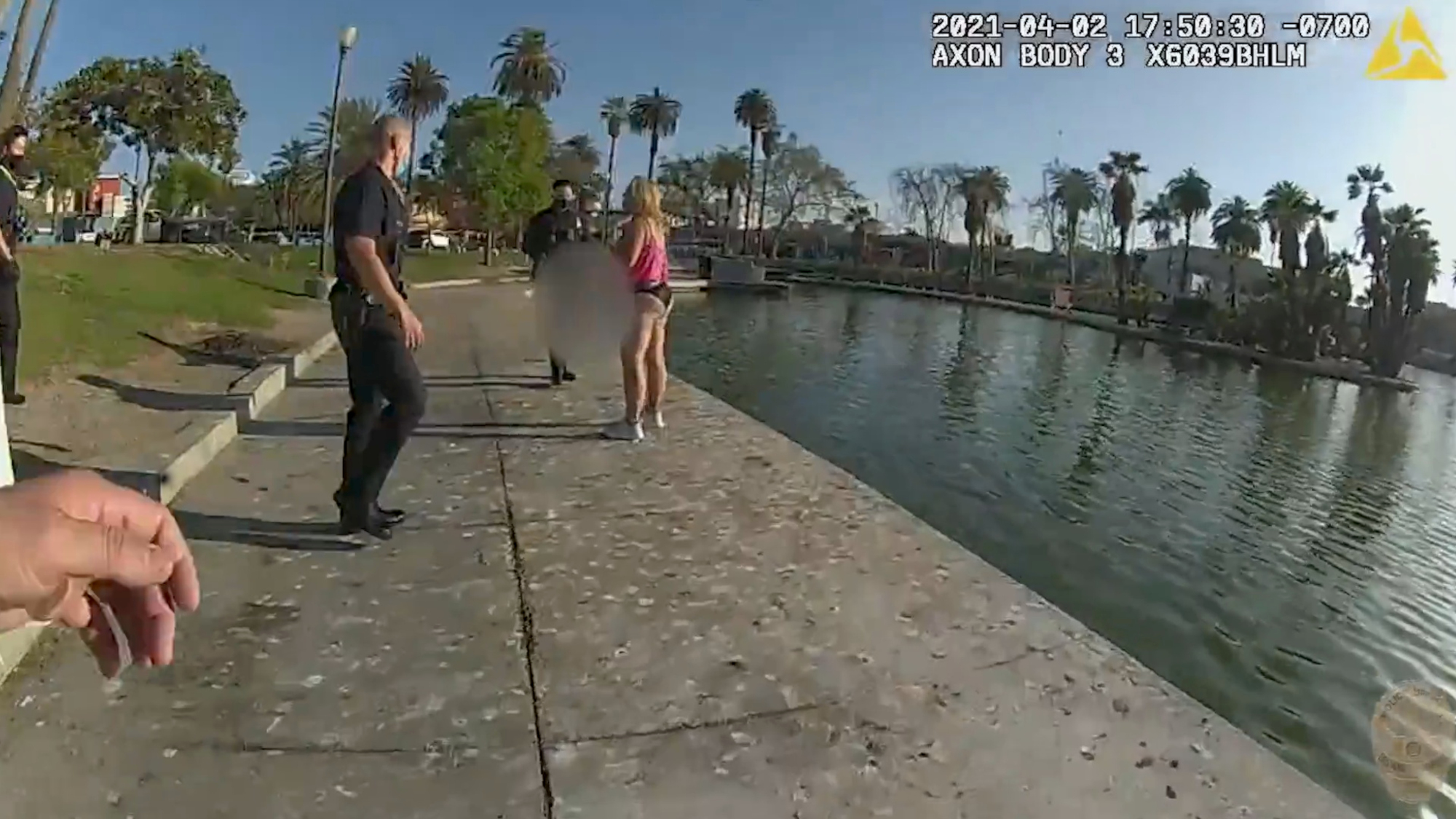 They ask her to turn around and lay on her stomach, which she refuses to do. She jumps into the lake, and the officers shoot with a 40mm less-lethal shot launcher. Police rush forward to detain her.