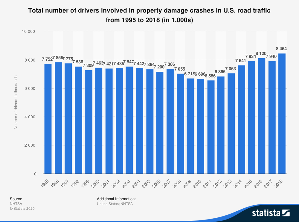 The number of drivers involved in property damage crashes are increasing with every passing year. Data shows the lowest number of cases reported in 2011, while the highest number of cases took place in 2018, since 1995. The number of drivers involved in property damage crashes in the U.S road traffic has changed significantly between 1995 and 2018.