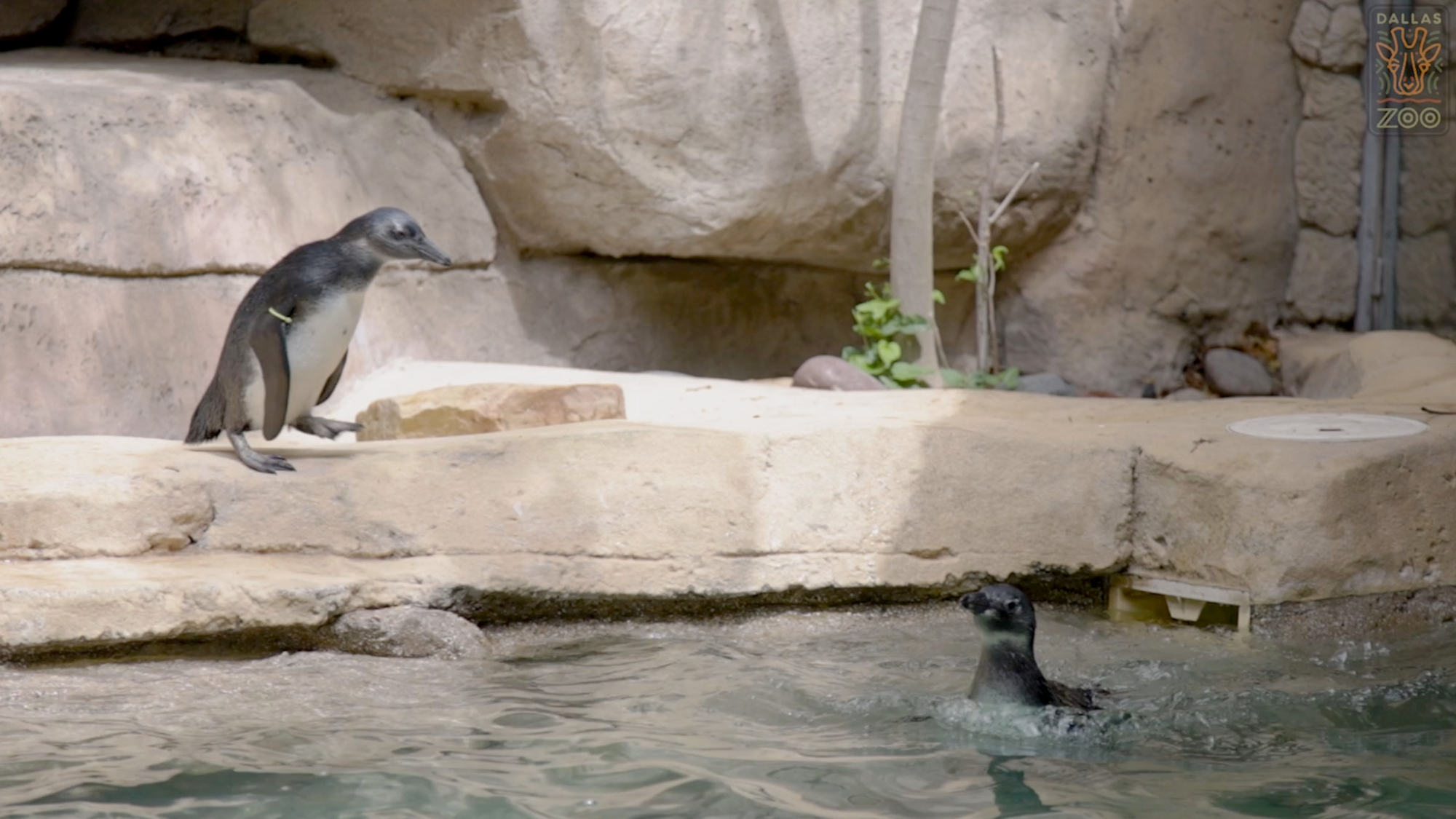 Two African penguin chicks at the Dallas Zoo experienced their first swim in front of visitors.
