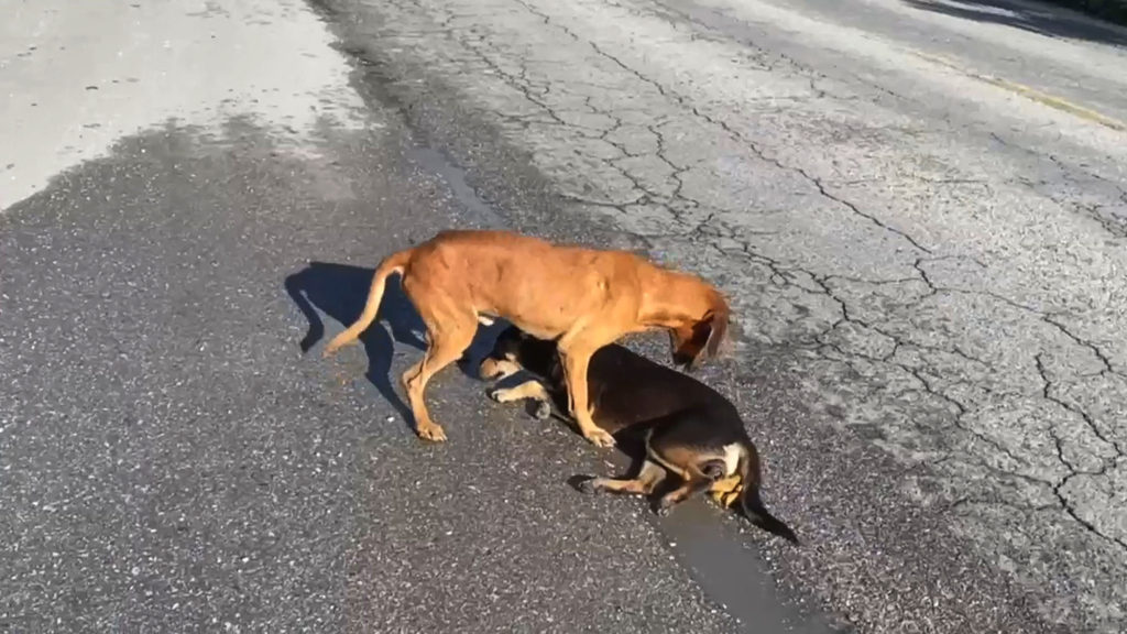 The footage (BELOW) shows the brown dog caring for its injured pal on the side of the road.