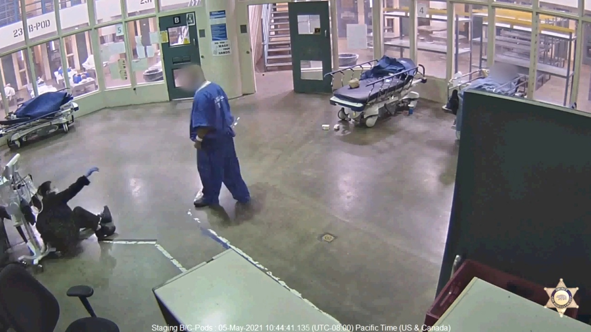 Surveillance video shows an inmate punching a Los Angeles Sheriff’s custody assistant, an Asian woman, when she hands him toilet paper at the Inmate Reception Center in Los Angeles, California, on May 5.
