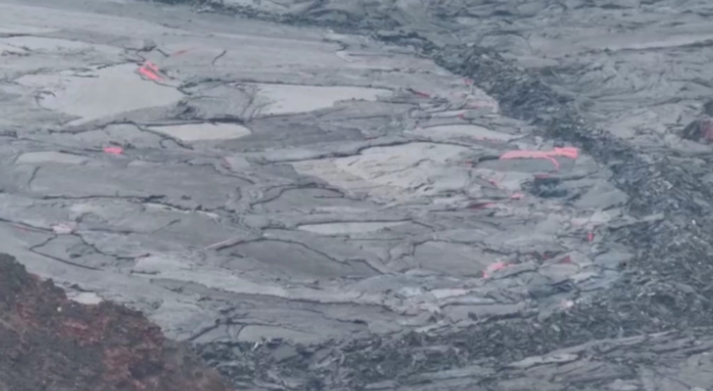 Another video shows the lava lake from the western volcano vent. The edges of the pouring lava have an orange neon hue.