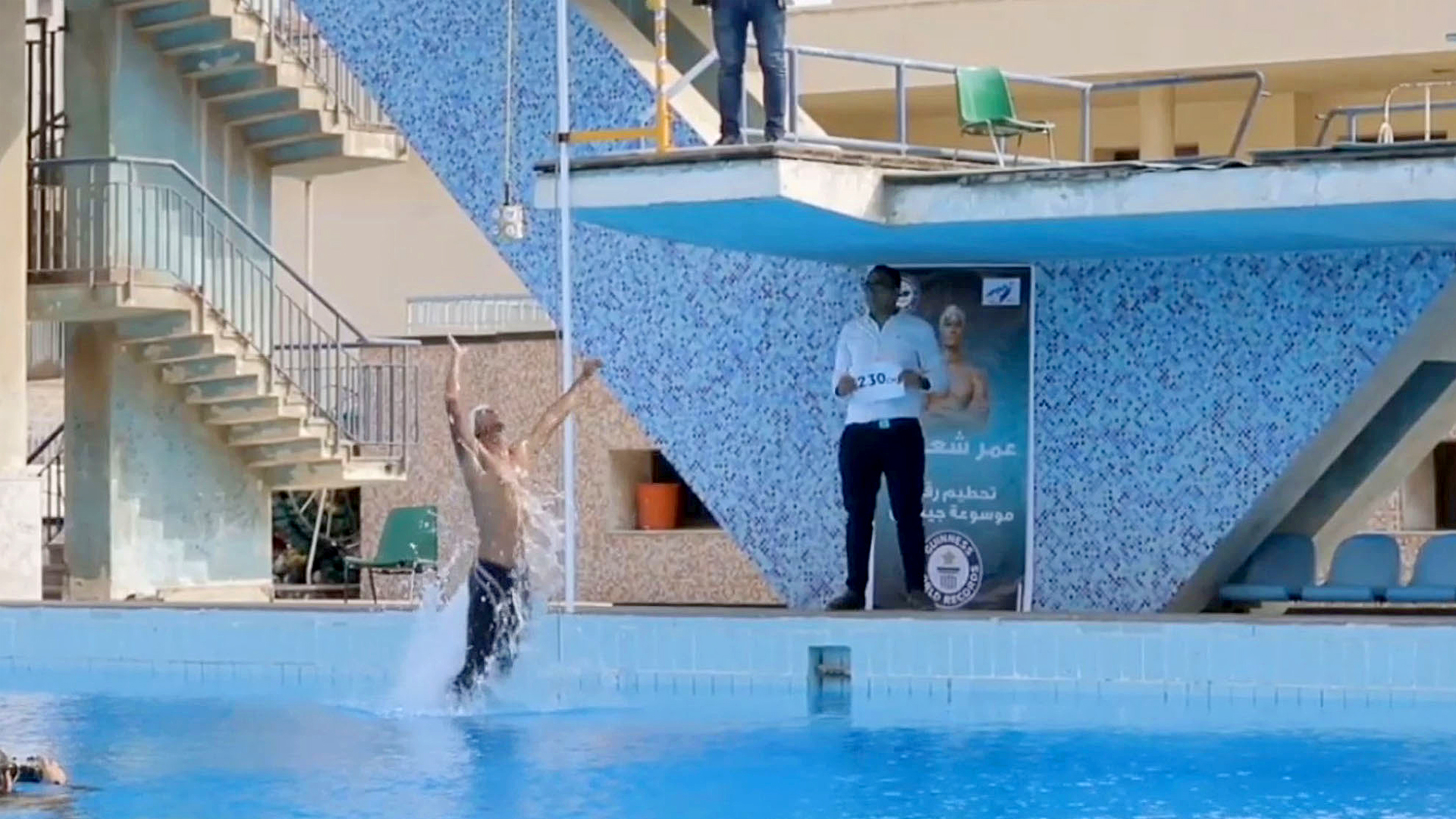 Omar Sayed Shaaban, 21, who trains at Cairo Stadium Swimming Pool in the Egyptian capital, set the Guinness World Record for the highest jump out of the water while wearing a monofin with 2.3 meters (7.54 feet).