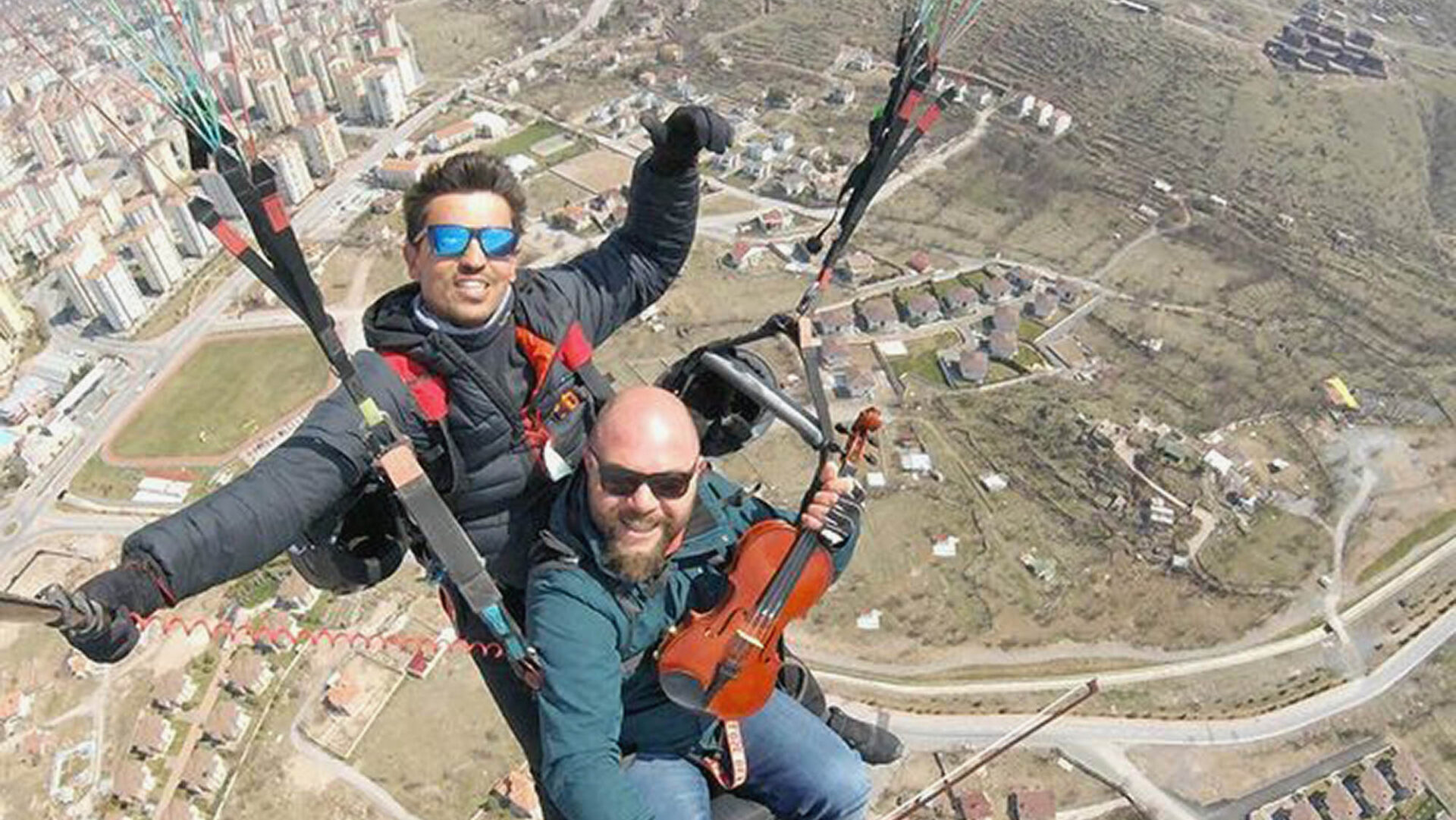 Er, who has been paragliding professionally for eight years, suggested Eren try it. He told him he just needed something to distract him from the fear. That’s when Eren decided to take the violin with him.