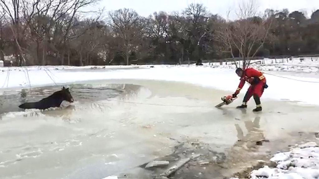 VIDEO: Texas Chainsaw Rescuer: Firefighter Saves Horse From Frozen Pond