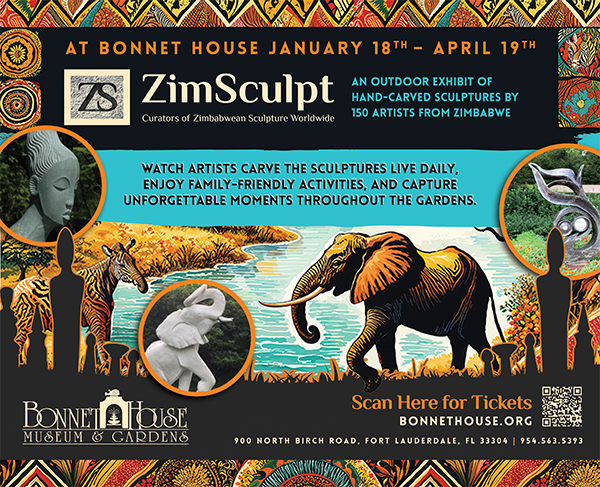 Bonnet House Museum & Gardens, a 35-acre subtropical estate and historic museum located in the heart of Fort Lauderdale, welcomes visitors to experience ZimSculpt, its new outdoor exhibit celebrating contemporary Zimbabwean stone sculptures. ZimSculpt has transformed the historic estate into a global showcase of Zimbabwean art, culture, and craftsmanship.