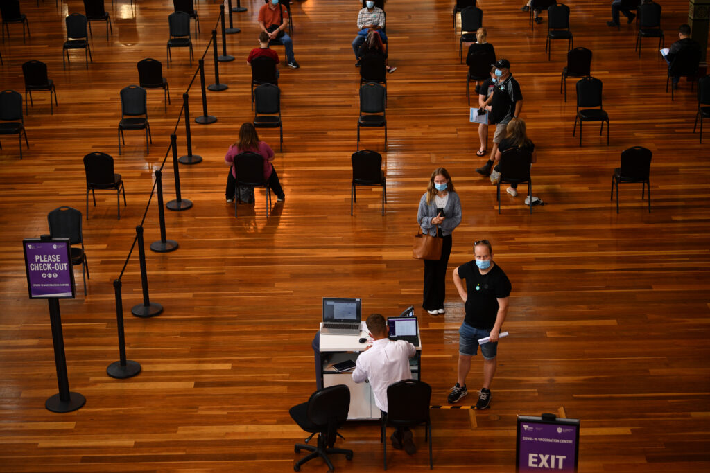 A general view of the vaccination centre at the Royal Exhibition Building in Melbourne. (James Ross/AAP Image)